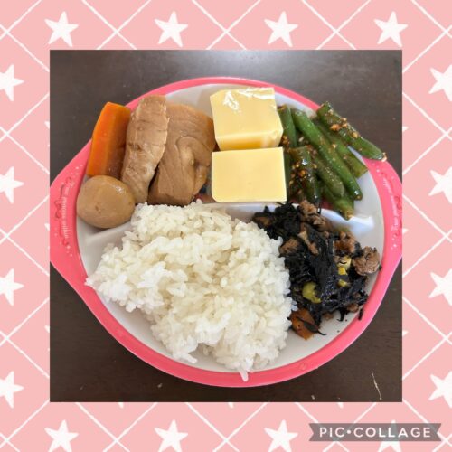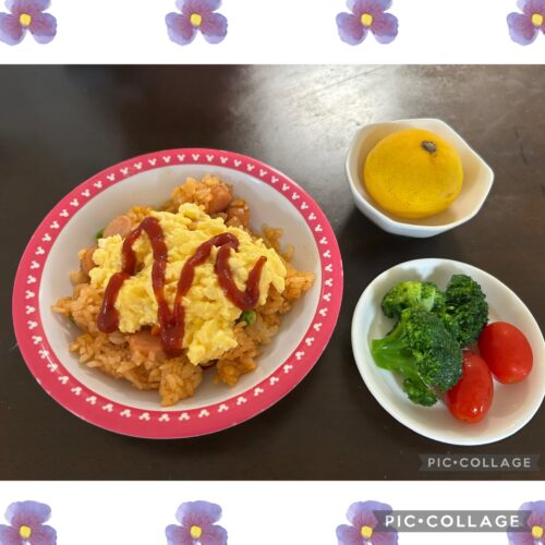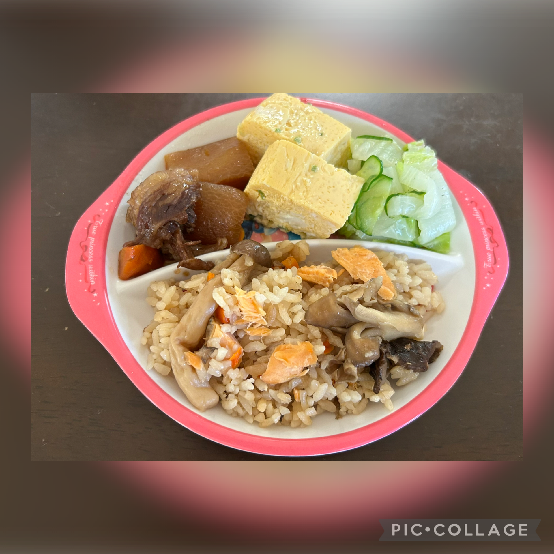 10/14〜10/17のごはん 2025.10.18 10/14のメニューは。。。 ・オムライス ・トマト&ブロッコリー ・みかん でした。 10/15のメニューは。。。 ・メカジキの煮付け ・たまご豆腐 ・ひじき煮 ・いんげんの胡麻味噌和え でした。 10/16のメニューは。。。 ・ハヤシライス ・マカロニサラダ ・黄桃 でした。 10/17のメニューは。。。 ・牛すじ大根煮 ・ネギ入りだし巻き卵 ・白菜と胡瓜の浅漬け ・鮭ときのこの炊き込みご飯 でした。