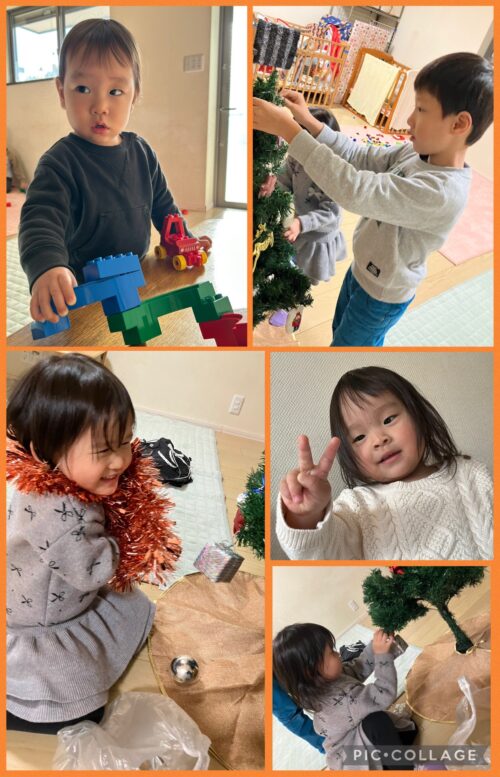 クリスマス楽しみだね! 2025.12.13 ブログの投稿が滞っており、大変申し訳ありません。1週間の様子をまとめて載せさせていただきますね。 風邪っぴきさんのお外NGやお外が寒すぎる日、先生たちのお仕事の都合で、なかなかお外遊びができていませんが、午後からみんなでスーパーに買い出しに出かけたりして気分転換しています♪(๑ᴖ◡ᴖ๑)♪ クリスマス製作やクリスマスツリーの飾り付けなど、園内もキラキラしています!楽しみなクリスマスが近づいてきて、みんなワクワクしているかな♪(๑ᴖ◡ᴖ๑)♪